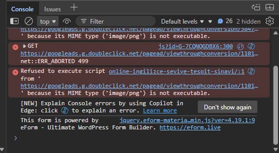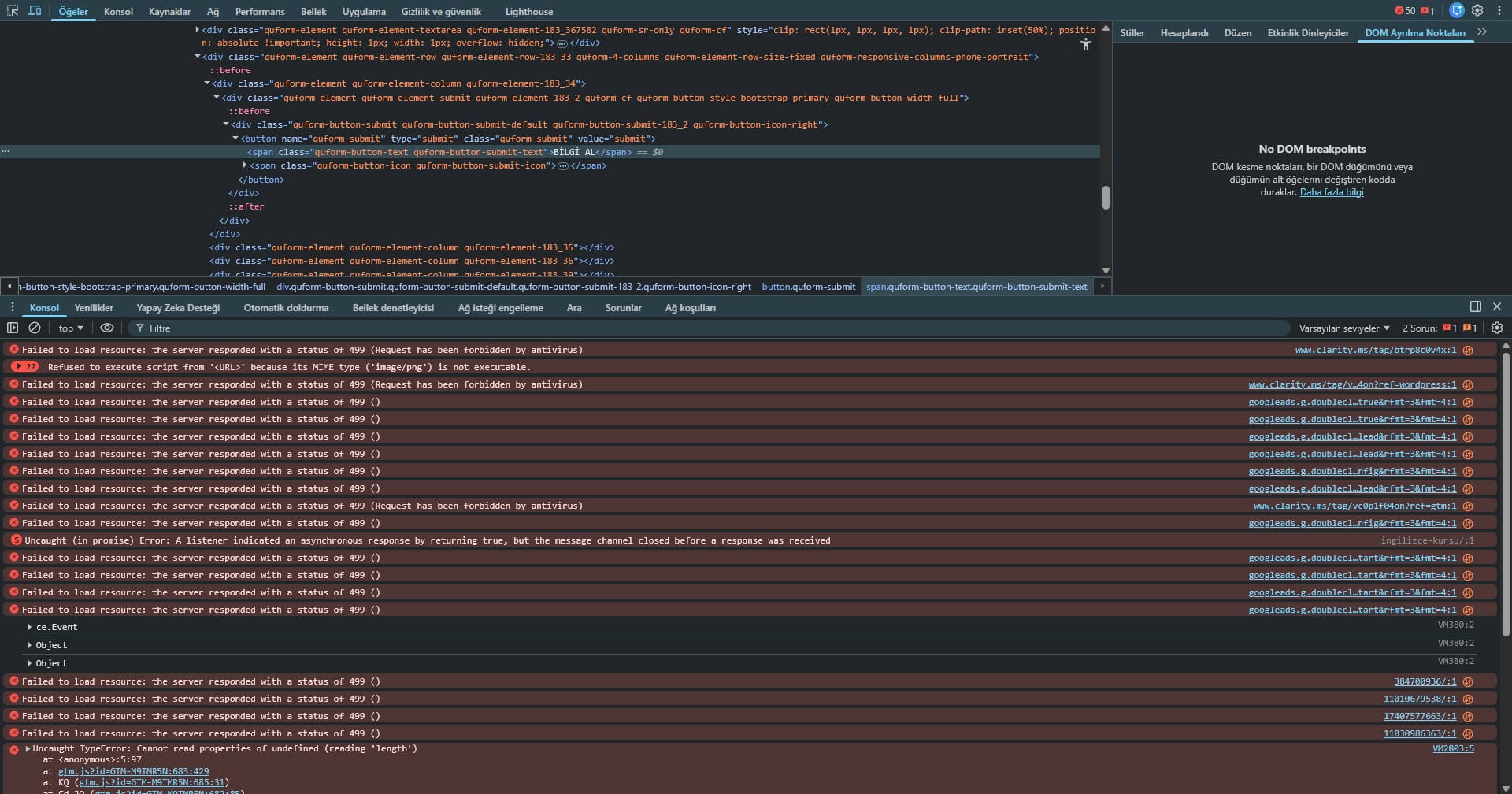 Bu yazı; bir WordPress sitesinde hem Bookly rezervasyon sistemi hem de İngilizce seviye tespit sınavı formu üzerinde yaşadığım, saatler süren inceleme sonucunda kaynağını Google Analytics / Google Ads / Microsoft Clarity gibi üçüncü parti scriptlerde bulduğum gerçek bir vaka analizidir.